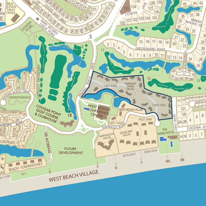 Nestled along the 16th and 17th fairways of Gary Player’s Cougar Point golf course, Fairway Oaks Villas are close to West Beach Village, the beach, and the Sandcastle — the oceanfront, owner-exclusive community and recreation center with private pool, outdoor bar and grille, and private beach boardwalk. The two, three, and four bedroom villas feature generously sized kitchens, combined living and dining areas, and large sliding glass doors that open out to decks with beautiful golf course, maritime forest, or lagoon views.