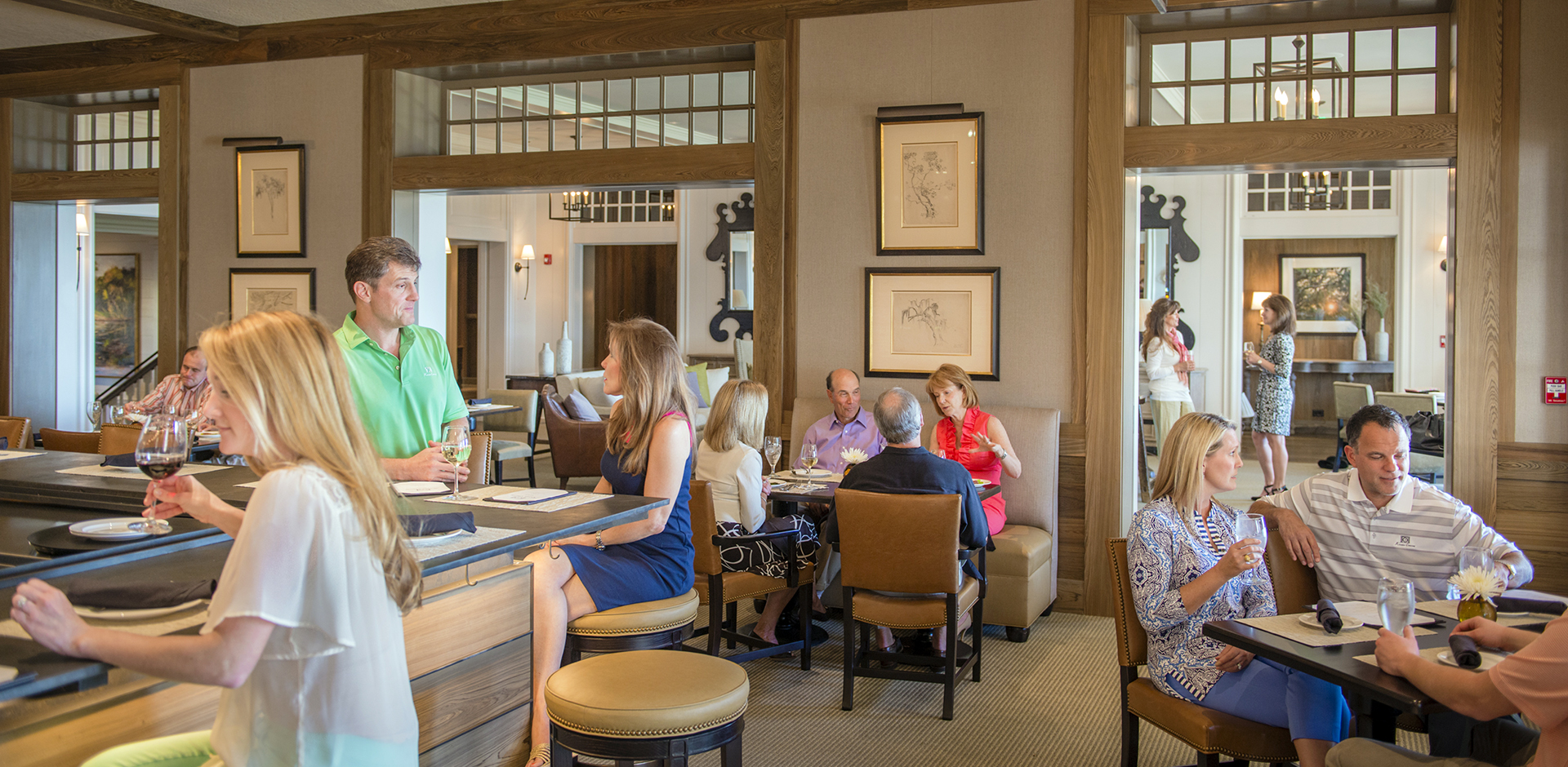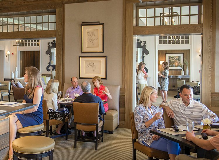 Deep wood tones, springtime greens, and muted golds welcome guests to Cassique’s exciting, new gathering space. Overlooking Tom Watson’s rolling, 18th green, the venue’s lively color palette mimics the sprawling landscape surrounding it. A sophisticated, refined aesthetic belies The Living Room’s relaxed, social vibe. A stately bar, bistro tables, plush banquettes, and leather sofas invite socializing with friends and family. Here, Members come together for lite fare, cocktails, and conversation throughout the day.