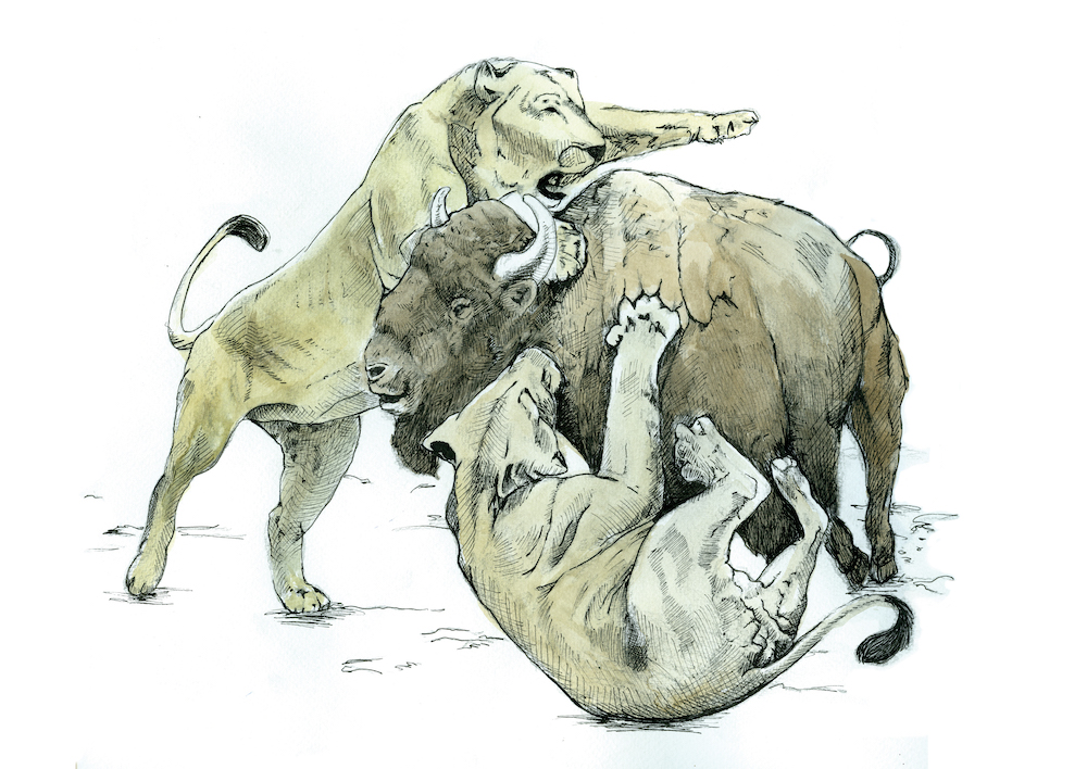 Although fierce predators, such as saber-toothed cats, jaguars, American lions, and dire wolves, stalked the large herbivores of the Ice Age, it may have been the combination of changing climate and human hunting that caused the extinction of these animals. In Alaska, the lower sea level during the Ice Age exposed an isthmus of land—the Bering Land Bridge—that connected western Alaska to eastern Russia. Hunter-gatherers who had lived in Asia for millennia took advantage of the new connection and became the first people (called Paleo-Indians by archaeologists) to inhabit the Americas, around 23,000 years ago. Likely, the earliest arrivals moved south along the coast, fishing and hunting seals. Eventually, as groups reached the southern edge of the great ice sheets, some moved inland, spreading into North America and down into South America. Approximately 12,000 years ago, Paleo-Indians were hunting the savannas of the Lowcountry.