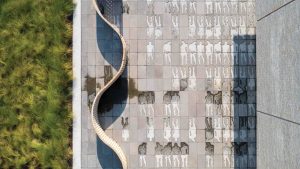 Hood’s garden-level design is infused with symbol and story at every turn, from benches surrounded with art installations, calling to mind slave badges, to a serpentine brick wall winding through wispy stands of sweetgrass, to a stele garden of abstract monoliths meant to honor African American heroes and ancestors, intentionally undesignated so viewers can choose and personalize their own steles.