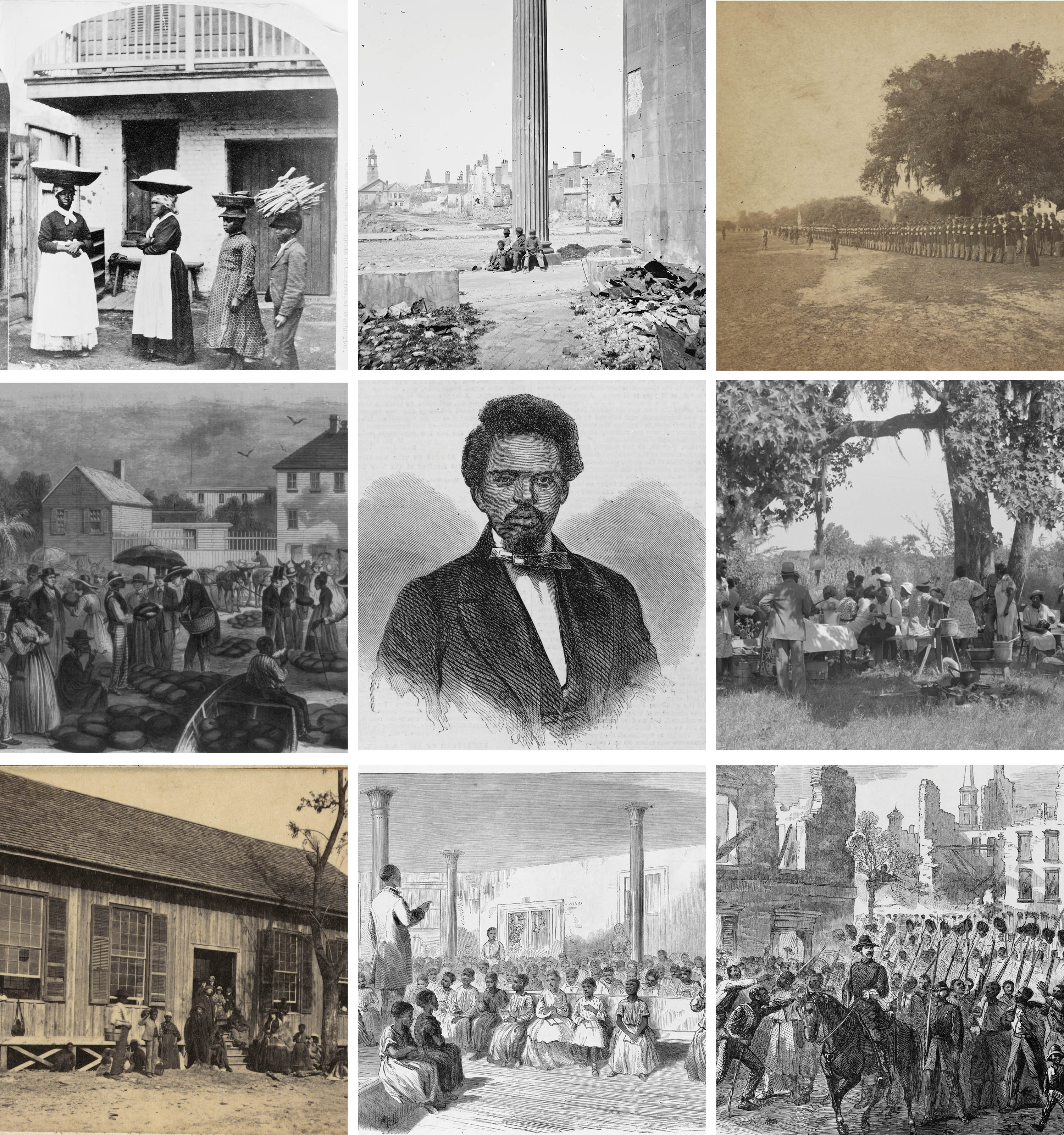 Credited left to right: African Americans working, Charleston, South Carolina || View of ruined buildings through porch of the Circular Church, Charleston, South Carolina, 1865 || First South Carolina Volunteers Hear the Reading of the Emancipation Proclamation near Beaufort, South Carolina, January 1, 1863 || Watermelon Market at Charleston, South Carolina, Frank Leslie’s Illustrated Newspaper, 1866 || Robert Smalls, captain of the gun-boat “Planter” || Watching a game at Fourth of July celebration, St. Helena Island, South Carolina, 1939 || Freedmen’s school, image by Samuel A. Cooley, Edisto Island, South Carolina, ca. 1862-1865 || Zion School for Colored Children, Charleston, South Carolina, by Alfred R. Waud, 1868 || “Marching on!”—The Fifty-fifth Massachusetts Colored Regiment singing John Brown’s March in the streets of Charleston, February 21, 1865