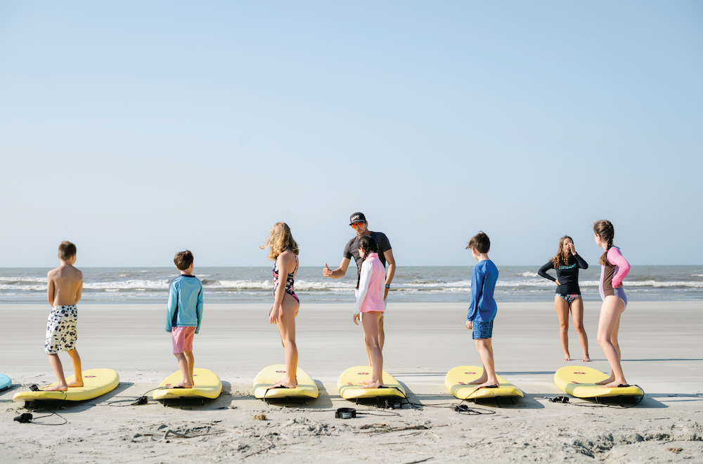 Surf camp is led by professional surfer Kyle Busey of Carolina Salt Surf Lessons. At The Beach Club, Kyle leads nine- to sixteen-year-old members through the basics. Campers learn how to paddle and push up into position, the fundamentals of stance and safety in the water.