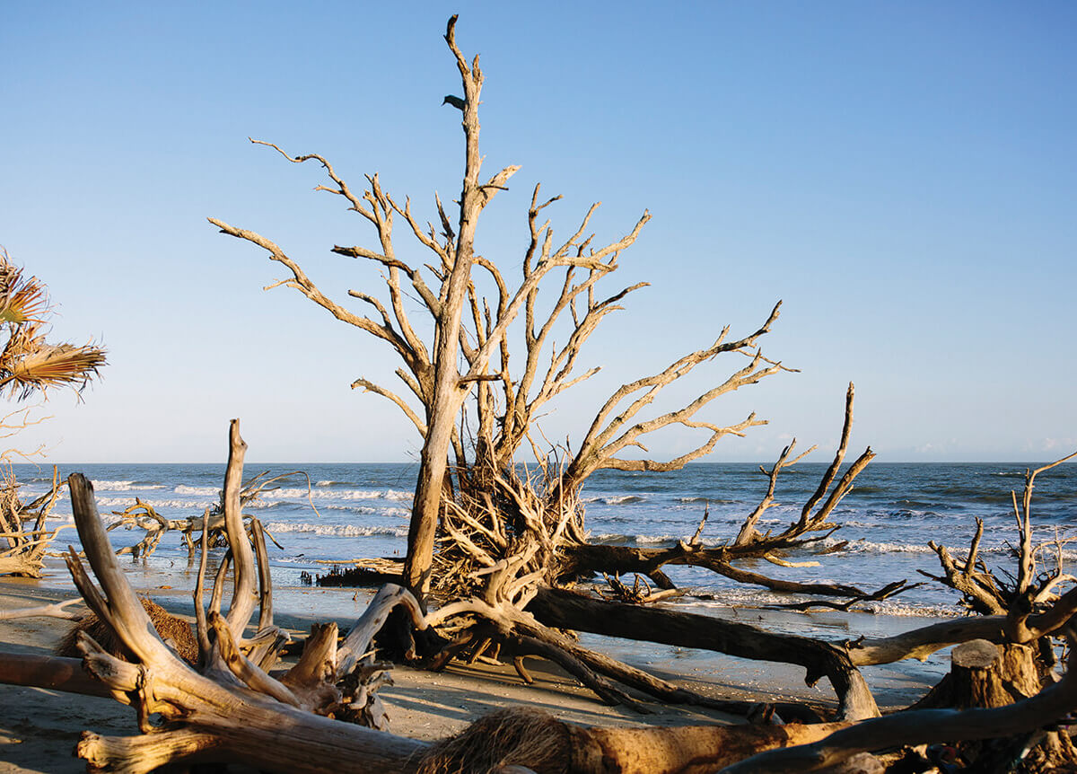 The view opens onto a beach as eerie as it is beautiful—instead of an expanse of sand, the two-mile-long beach is a “boneyard” of sun-bleached trees toppled by an eroding shoreline. Time your walk to avoid high tide, when the beach disappears under water almost completely. As the tide pulls out, you’ll find shells (carbon dating has placed some shells as far back as 4,200 years), shark’s teeth, Native American pottery, and pieces of slave-made brick.