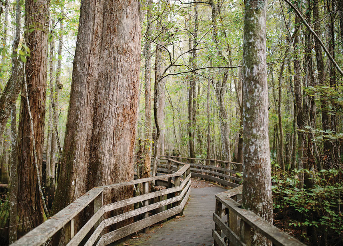 As you begin to stroll the 1.75-mile elevated boardwalk loop through Beidler Forest, you might mistake the peaceful soundscape of the world’s largest virgin cypress-tupelo swamp for silence. After a few minutes, you’ll realize what you’re hearing isn’t actually silence at all: periodic flutters of white ibis wings, woodpeckers, even the gentle dip of water snakes around cypress knees, and dampened steps of deer in the swamp become a chorus of natural noises that will transport you to a more primitive version of South Carolina.
