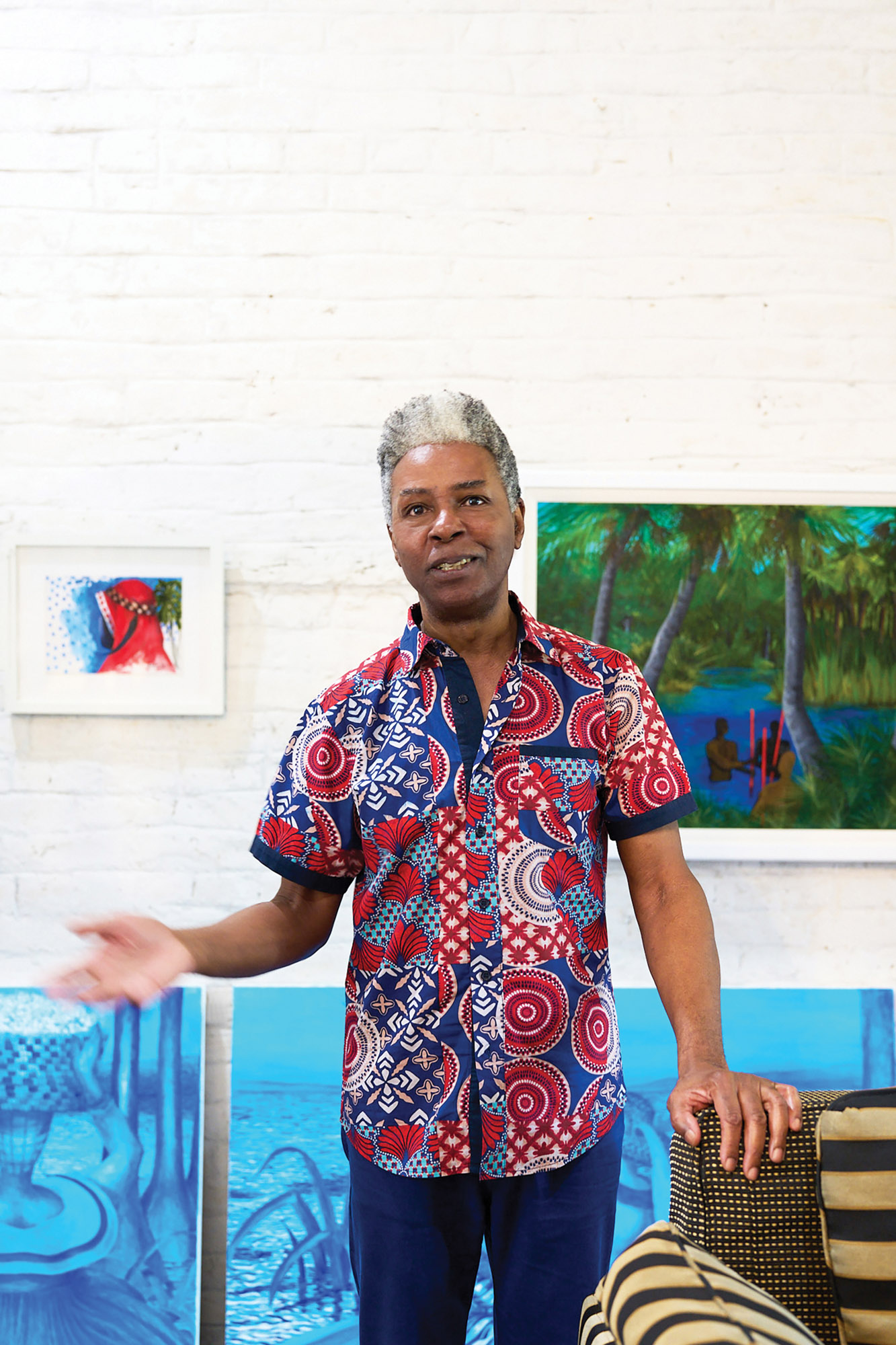 In his downtown studio near The Charleston Place hotel, Green, an improbable sixty-eight (a slight, handsome tinge of gray is the only hint he’s not thirty-eight), is at work on a new series, several canvases in early stages washed in a base layer of vivid indigo blue. “This is how I start, with the color that warded off evil spirits and designated the house of a healer. Using natural, living paint that is so connected to African mythology is a way to enter the past.” Plus, he adds, “It gives the canvas such vibrancy.” Against that blue background, outlines of women are beginning to emerge—two balancing baskets of flowers on their scarf-wrapped heads, one ferrying a small boat loaded with flowers headed to the market.