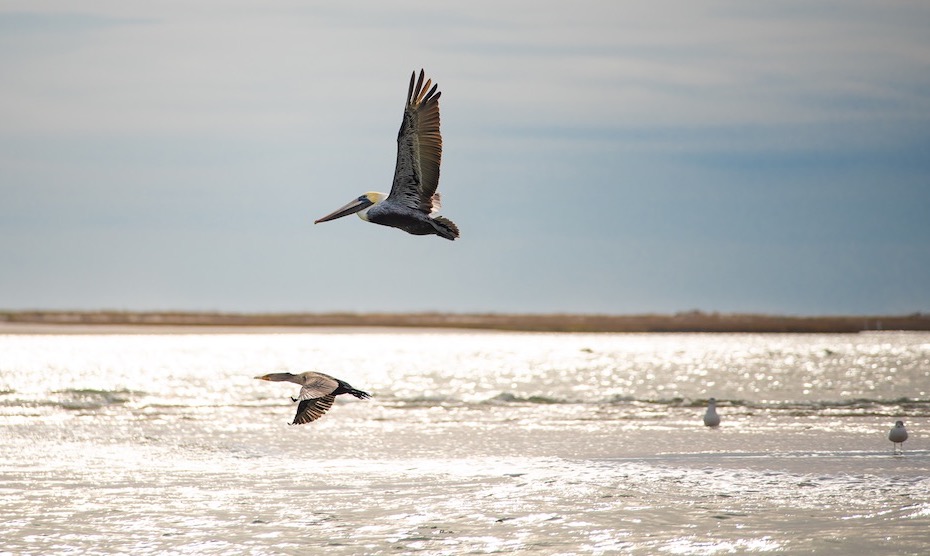 Large in stature, Brown Pelicans are commonly seen flying above the shoreline or perched on a marina dock. These birds feed by diving into the water and using their long bills to capture fish.