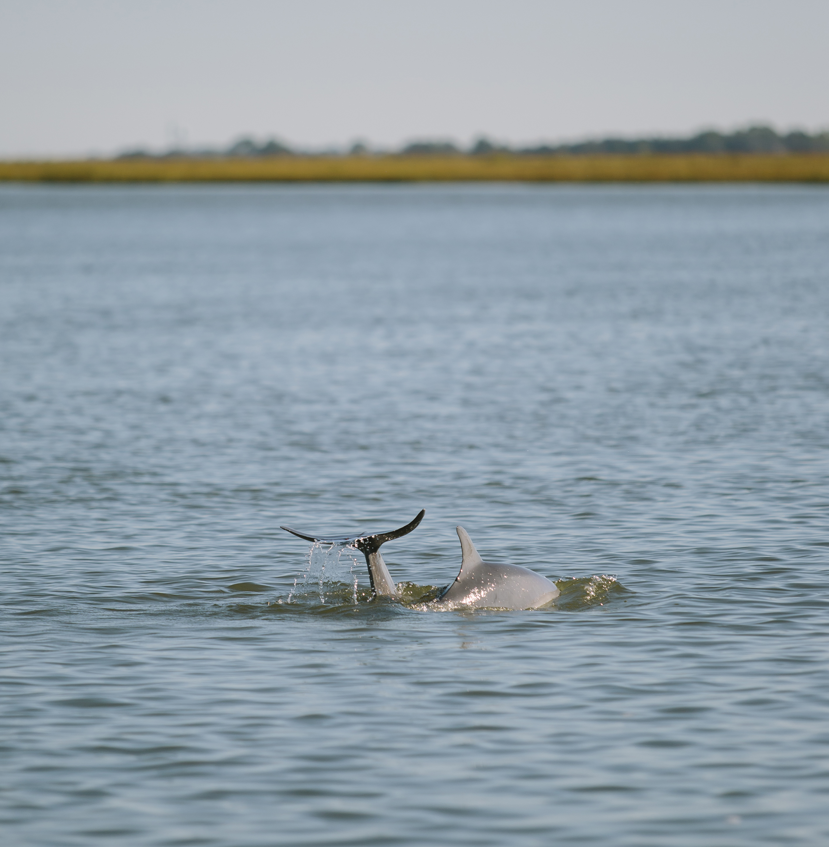 We set out east on the Kiawah River. I lay flat on the prow, with Tide panting by my side. He whines when he sees a dolphin fin breach the surface to our left. “I swear he can communicate with them,” Elliot yells from behind the helm. “They gather around the boat when I bring him.” Tide scrambles port to starboard and back again, whimpering with excitement. Sure enough, we hear the pooooshof three more dolphins breaching just a few feet ahead. “Is this the Kiawah River pod?” I shout into the wind. Elliot nods and grins. The Kiawah River is magnificent in the clear afternoon sun, the marsh golden. In just a few short weeks it will turn a gray-red and shed large mats of cordgrass out to sea.