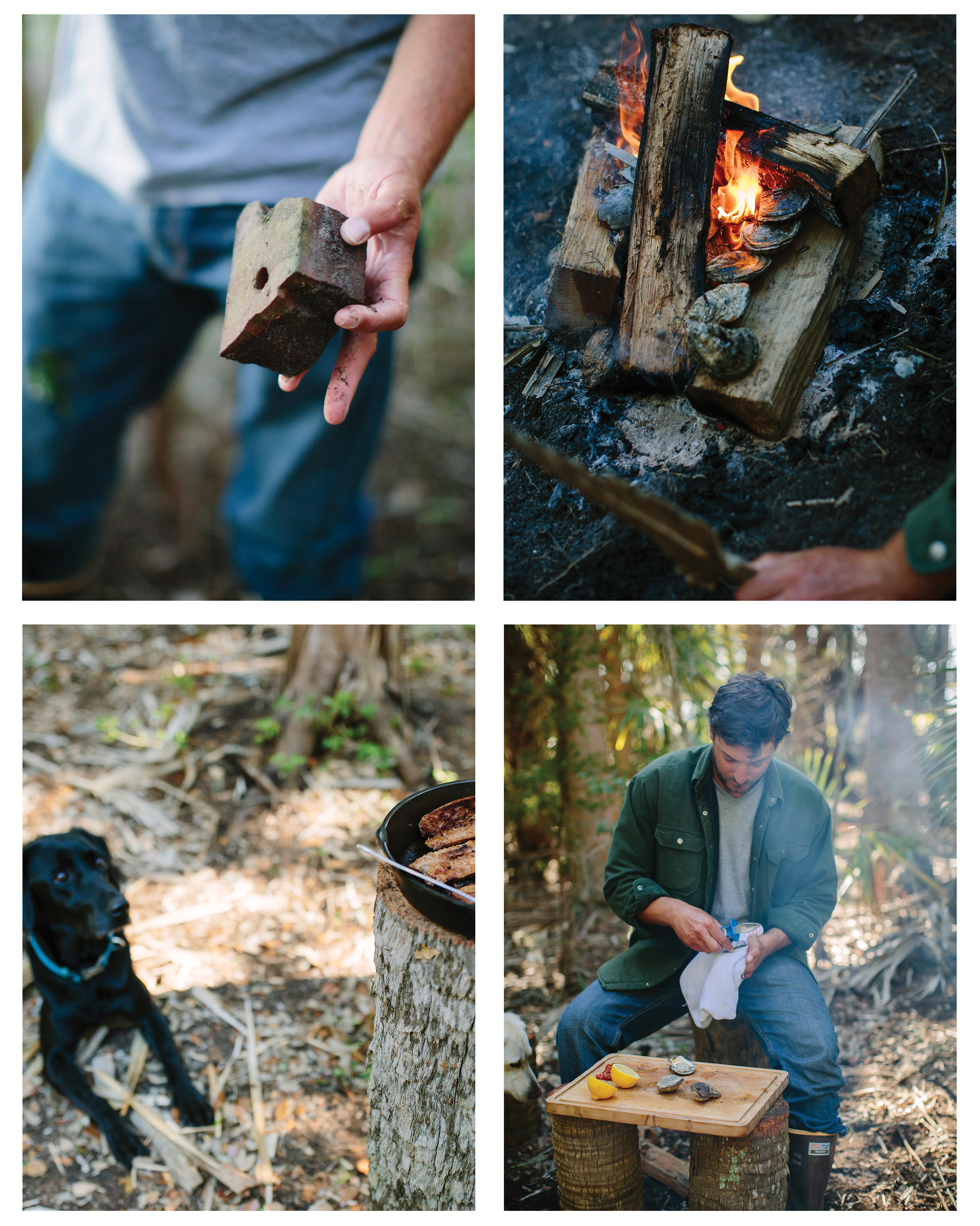 We pull up to the small hammock on the leeward side. The dogs bolt onshore in a flash, disappearing into the dense bush. We unload the gear and Elliot produces a small chainsaw from the back of the boat. He promptly finds a downed palmetto trunk and saws it into six three-foot stumps for seating around the fire. It is still quite light and we explore for a bit, watching the tide suck away from the island and out to sea, climbing into the lower branches of a gnarled cedar, and picking the best spots to pitch our tents. A little later on, we hear calling from the creek and another boat pulls up next to ours. J.D. Hunter and his girlfriend Katie B. are old friends of Elliot’s, and they are joining us for dinner.